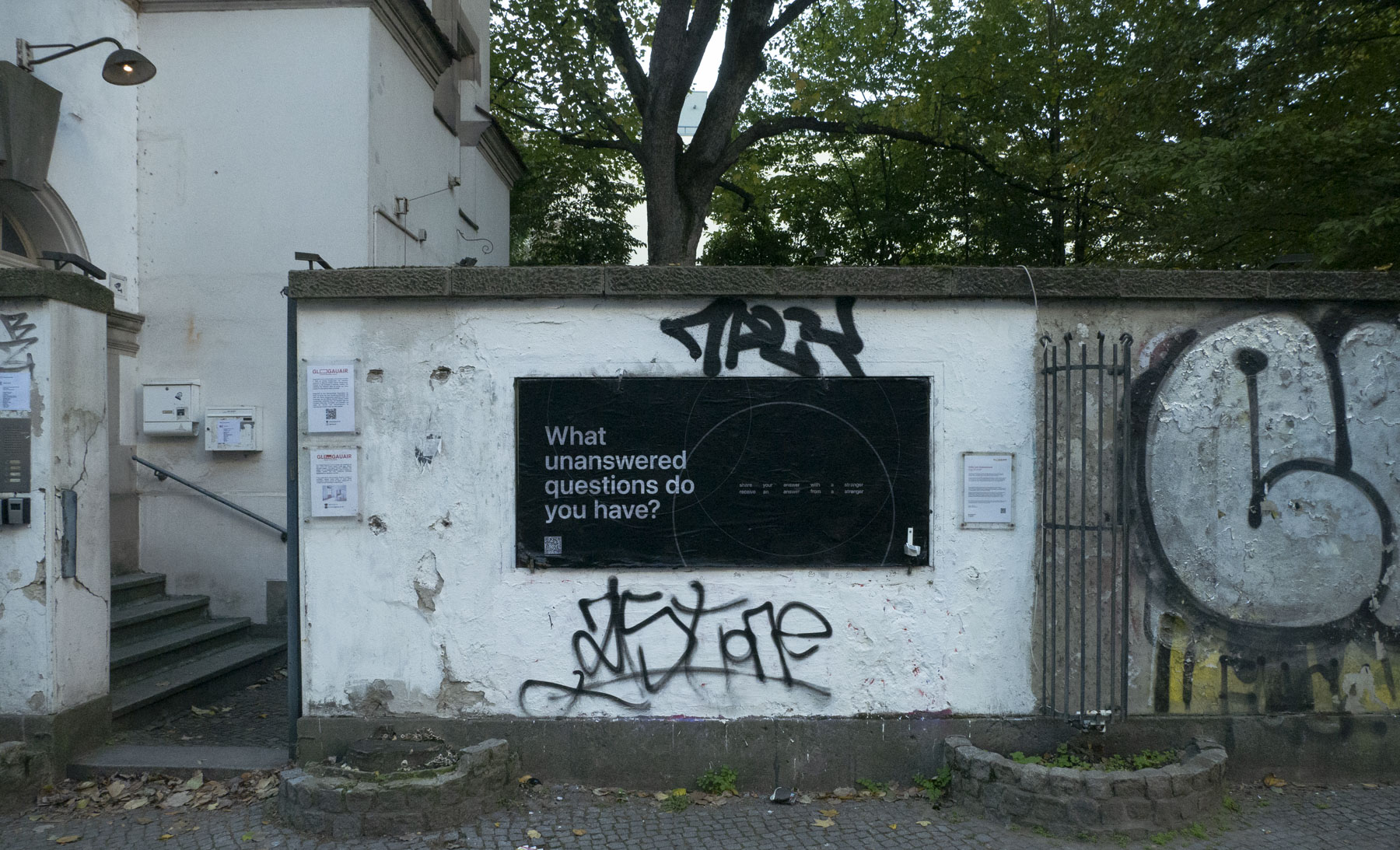 Throughout the iterations of this project, questions have been posted throughout various cities, with a QR code and a link that connects the participant to the corresponding question on the interface. The participant then has the option to answer the question, to share their answer, and to receive an answer from a stranger via email. When we meet strangers, we often catch ourselves proceeding with caution, sometimes the experience feels mysterious, even magical. The experience is designed with these sentiments in mind — at the beginning of the experience, the participant is met with little to no information to explain its purpose or direction.